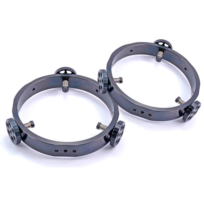 3 adjusting screws (M10) with 10mm Ø, ball bearing bearing surface made of V2A steel, covered with a hard rubber sheath (i.e. the screw pressure surface does not rotate during the adjustment of the telescope!). The guiding telescope is absolutely solid, non-slip and will not be scratched! A further four milled planar surfaces with a photo-threaded hole are installed on the outer diameter in order to be able to attach additional accessories to the rings on the outside or to connect several rings together!