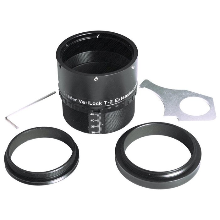 Les nouveaux tubes d'extension VariLock T-2 de Baader vous offrent une possibilité de réglage complète pour vous permettre de régler ou de faire varier exactement l'espacement entre les composants T-2. Parfait pour le positionnement exact des réducteurs, des correcteurs de coma et d'autres composants du système optique ou d'imagerie.